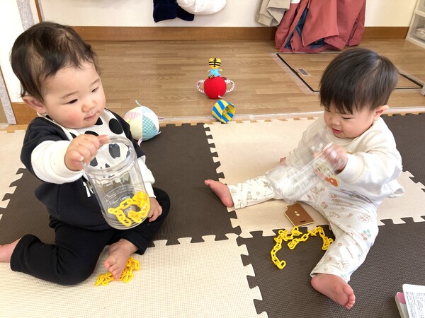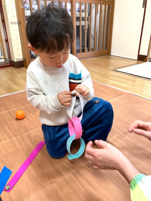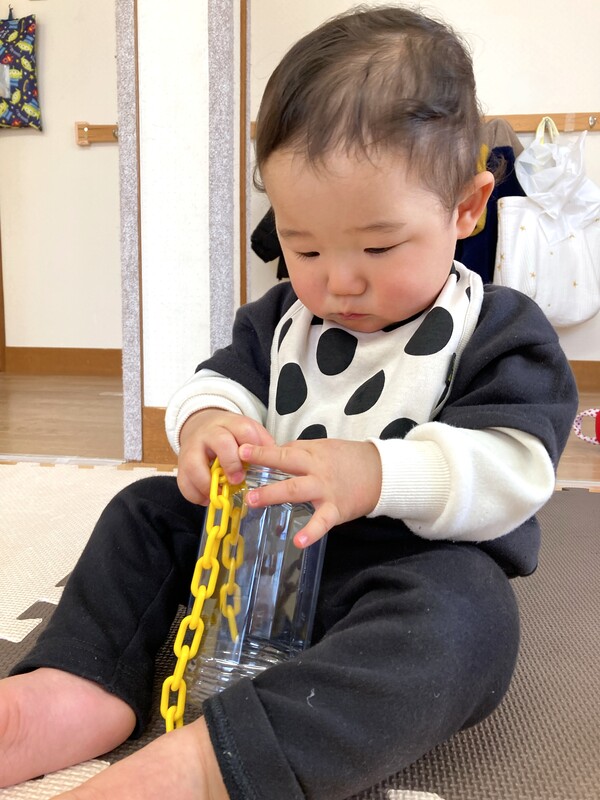 指先あそび 指先を使ってくさりを上手に持ち、筒に入れようと真剣なぱんだぐみさん。洗たくばさみで物をはさんだり、輪つなぎあそびを楽しむこあらぐみさん。各年齢に合わせて、指先を使ったあそびを日々楽しんでいます。 2026/01/27