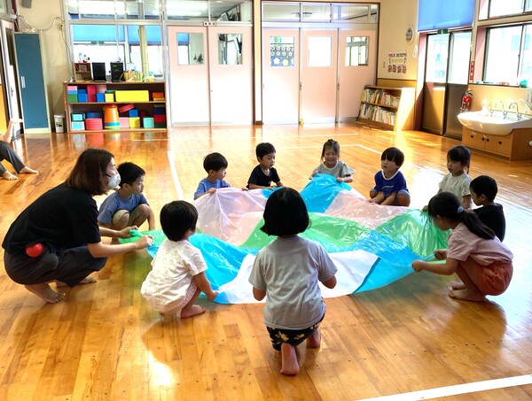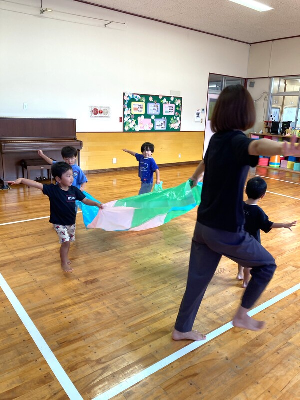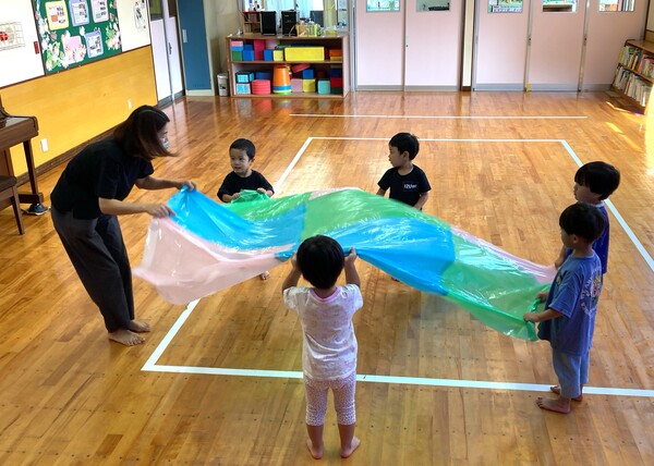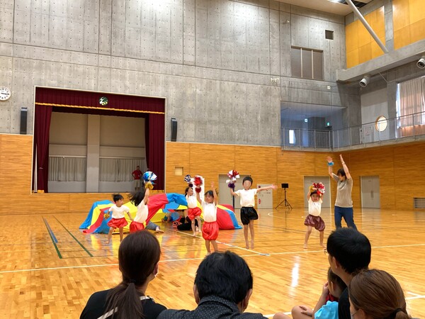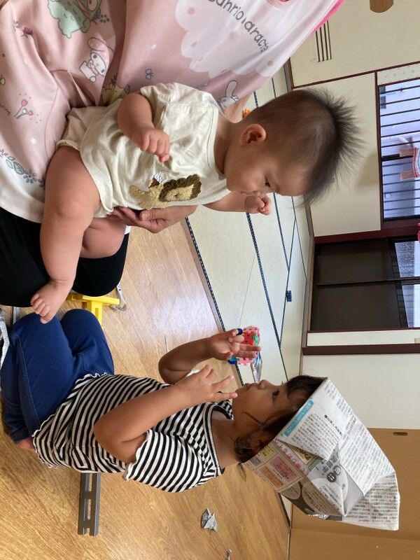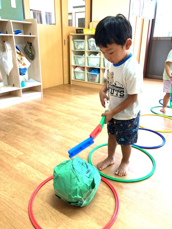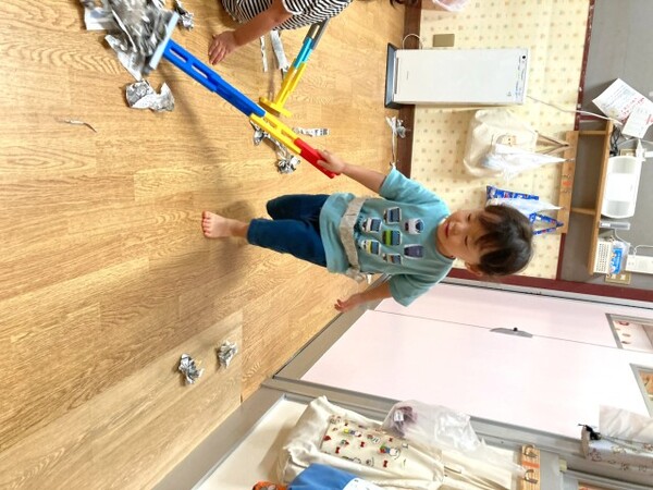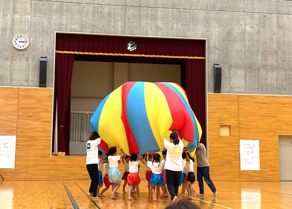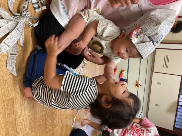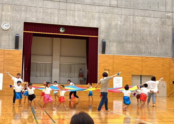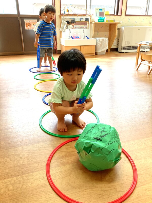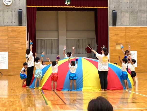 ミニバルーン りす・うさぎぐみさんが、大きい子の真似をして、バルーン遊びを楽しみました。はじめてなのに、とっても上手(^^)今まで大きい子が楽しんでいる姿を、しっかり見ていたのですね!!音楽を聞きつけて、きりんぐみさんも集まってきました!「おしえて〜!」「いいよ〜!!」と最後は、一緒に楽しみました(^^)/楽しかったね!・・・・・その様子をじーっと見つめるのは、こあら・ぱんだ組さんです(^^) 2025/08/26