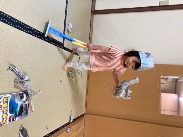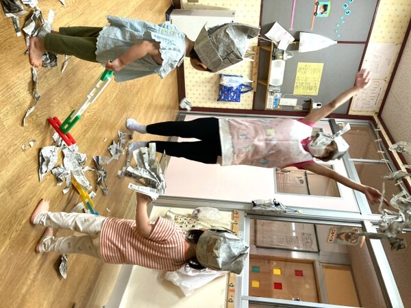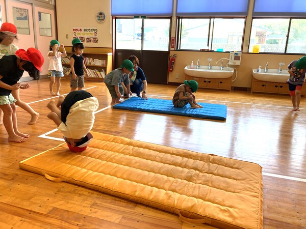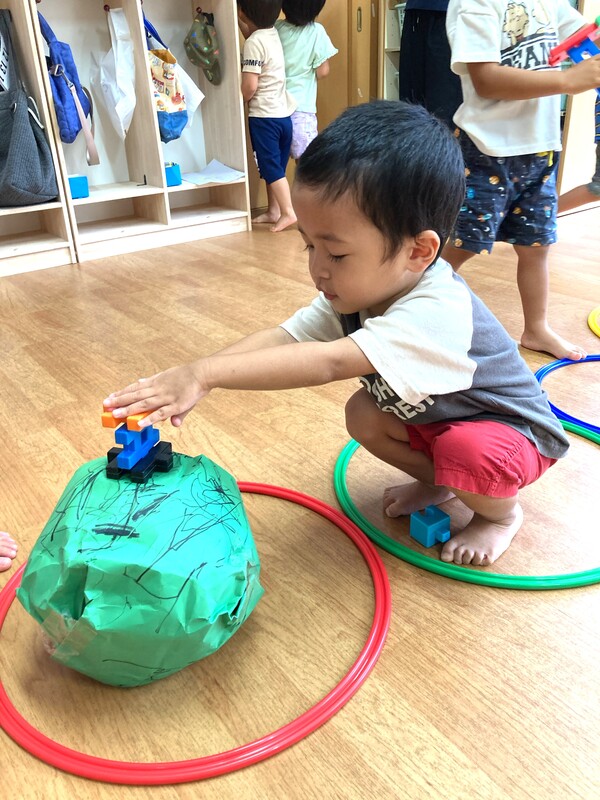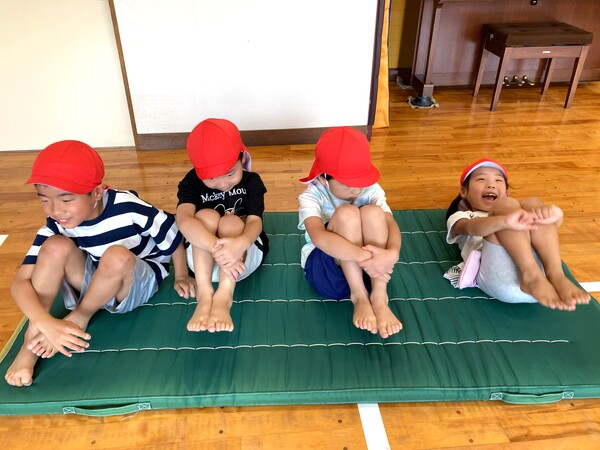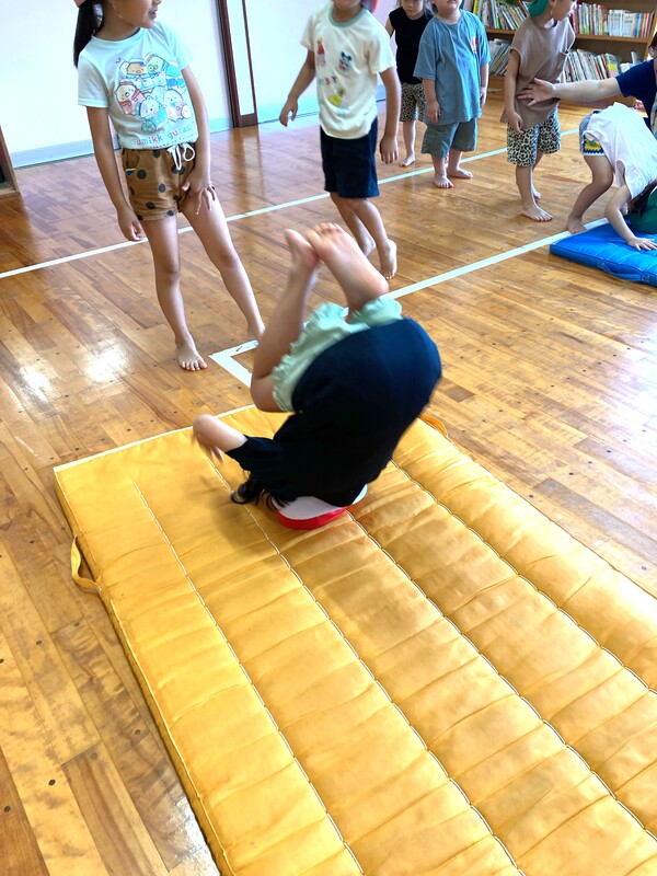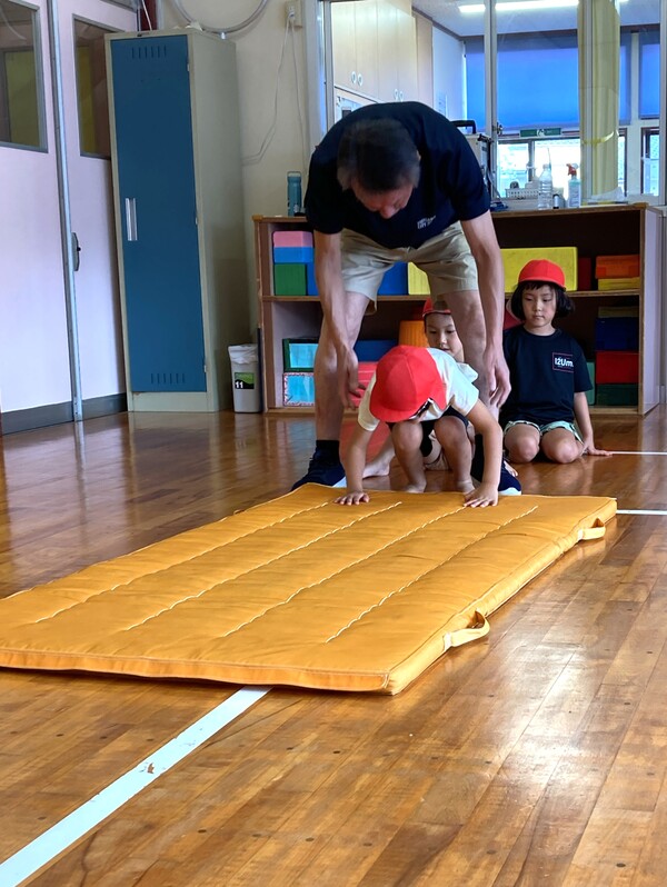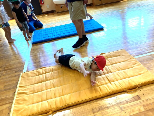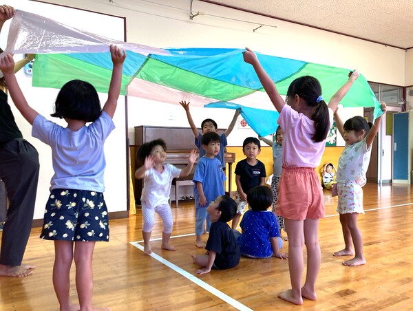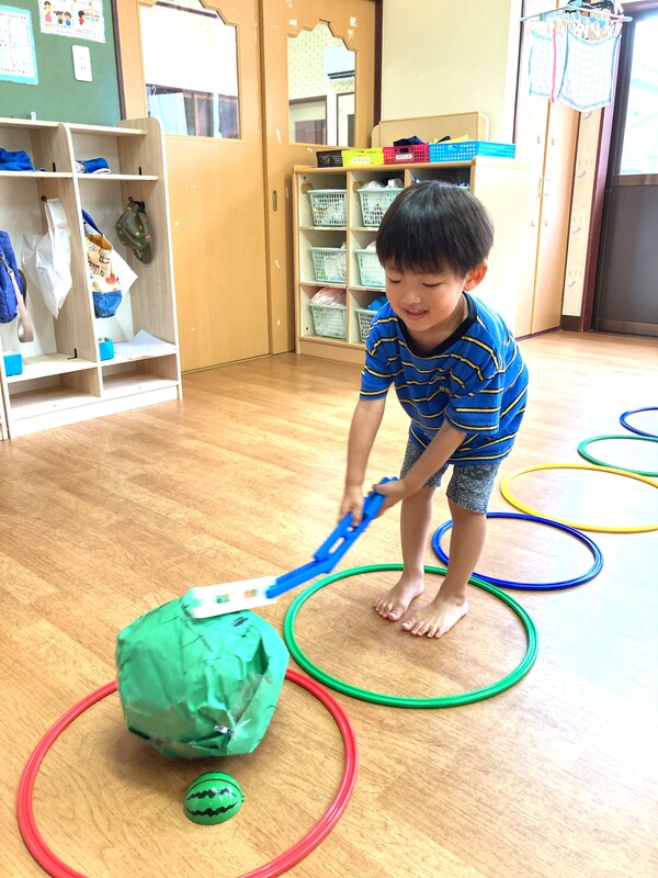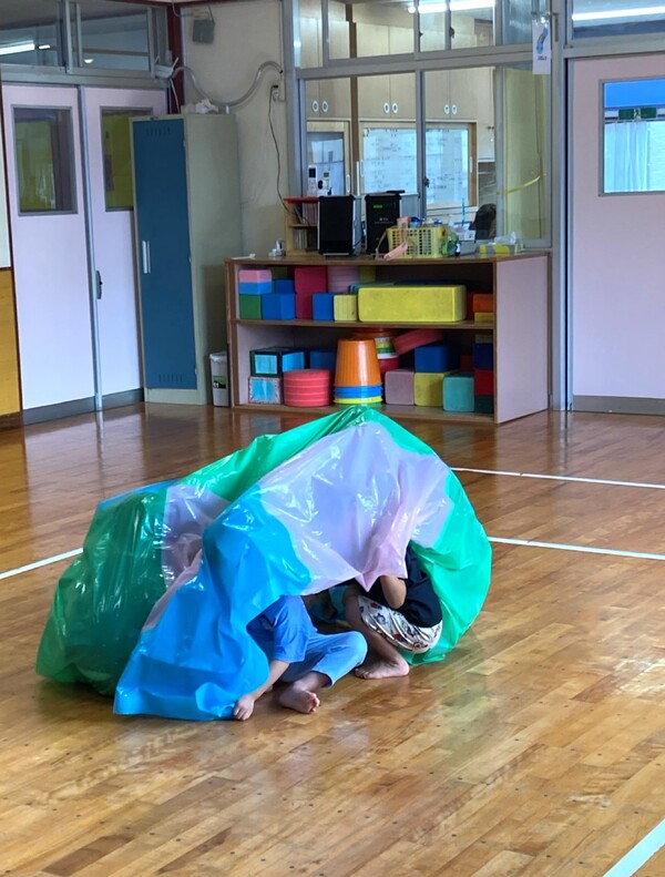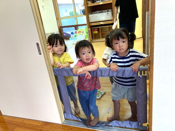 ミニバルーン りす・うさぎぐみさんが、大きい子の真似をして、バルーン遊びを楽しみました。はじめてなのに、とっても上手(^^)今まで大きい子が楽しんでいる姿を、しっかり見ていたのですね!!音楽を聞きつけて、きりんぐみさんも集まってきました!「おしえて〜!」「いいよ〜!!」と最後は、一緒に楽しみました(^^)/楽しかったね!・・・・・その様子をじーっと見つめるのは、こあら・ぱんだ組さんです(^^) 2025/08/26