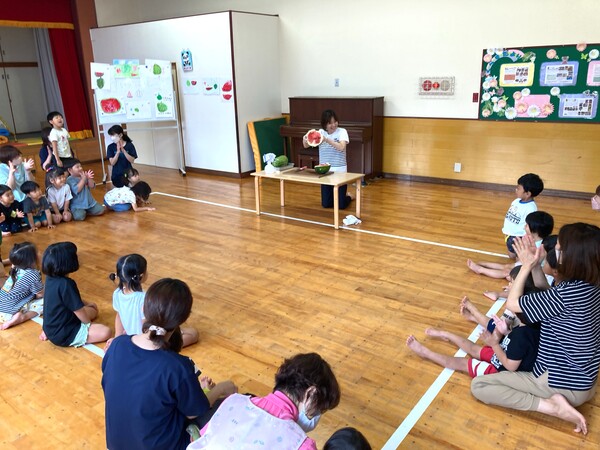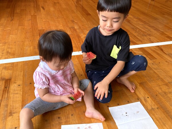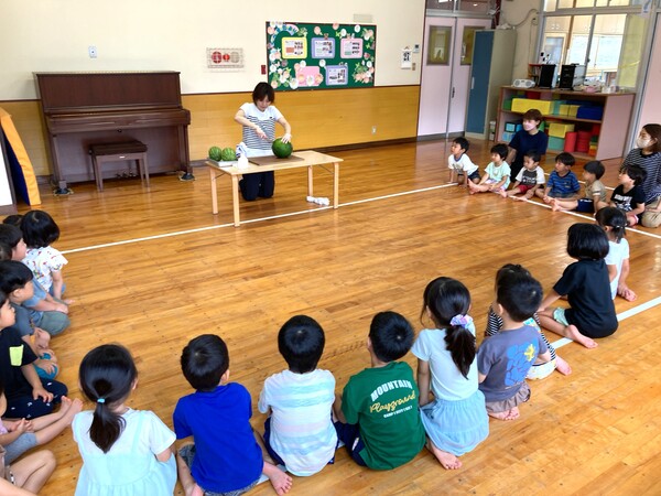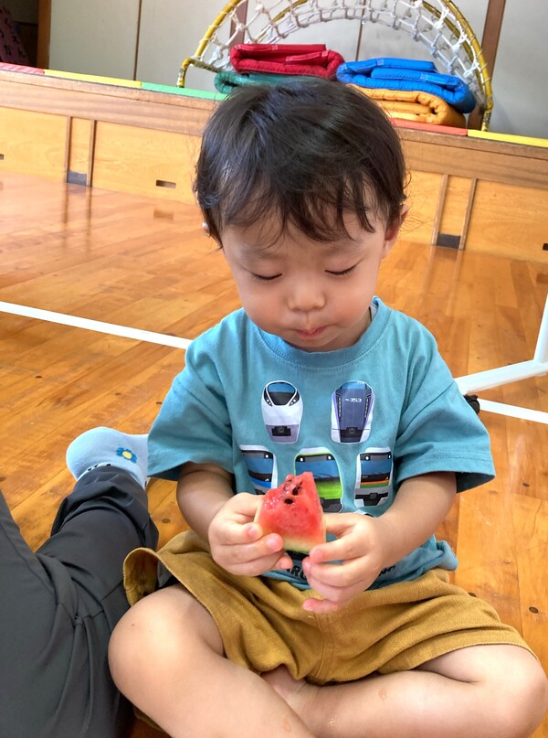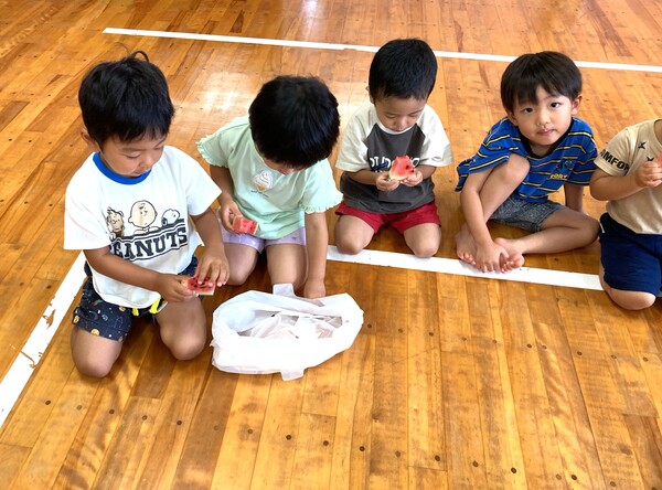 すいかパーティー🍉 きりんぐみの「すいかパーティーはじまるよ!!」の声に、ホールにみんなが集まってきました!他のクラスのお友だちにも食べさせてあげたいとのきりんぐみの優しい気持ちから、今日は、みんなですいかパーティーです(^^)/子どもたちがじーっと見つめる中、すいかが半分に切られ、中の真っ赤な果実が見えると歓声が上がりました〜(^^)とても甘くておいしいすいかに、みんな夢中です。おかわりもたくさんしましたね!きりんぐみの育てたすいかは、全部で6個収穫できました!!大豊作でしたね!きりんぐみさん、ありがとう♡ごちそうさまでした♡ 2025/08/27