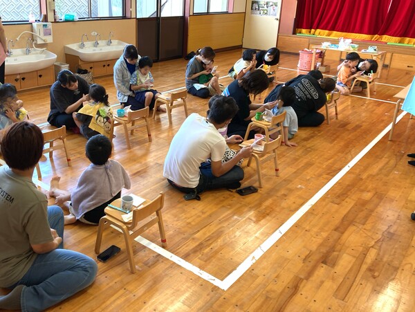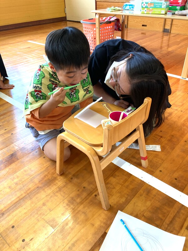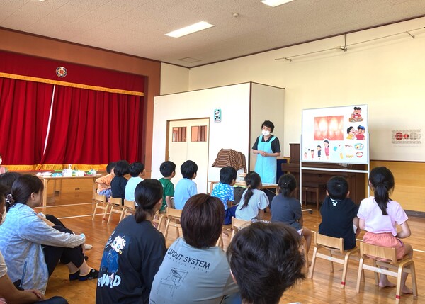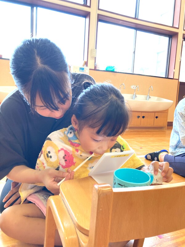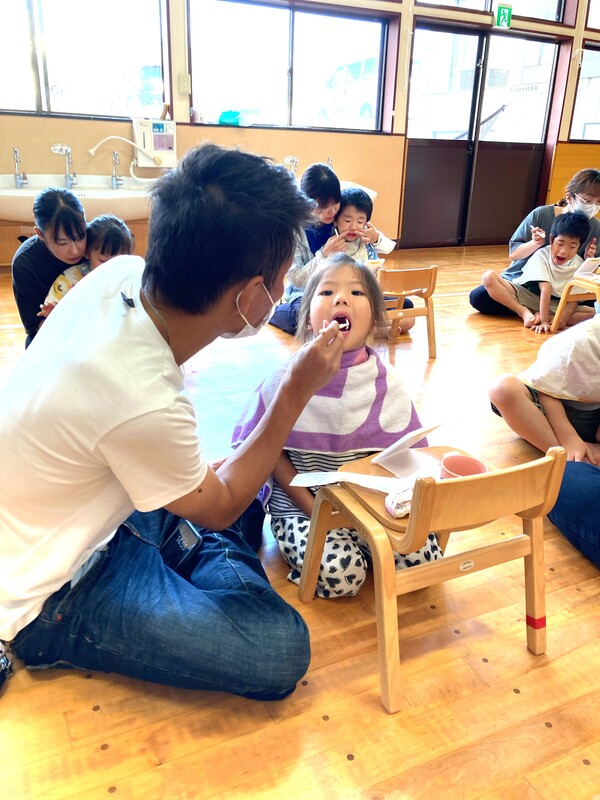 虫歯予防教室 虫歯予防教室が行われ、きりん組親子が参加しました。糸魚川市の歯科衛生士さんと保健師さんが来られ、どうして歯にばい菌がつくのか?それをとるための歯磨きの仕方は?などを学び、その後、親子で歯石の染め出しとブラッシング指導を受けました。乳歯から永久歯に生え変わる時期、今日学んだことを生かして歯を大切にしていきましょうね。 2025/09/18