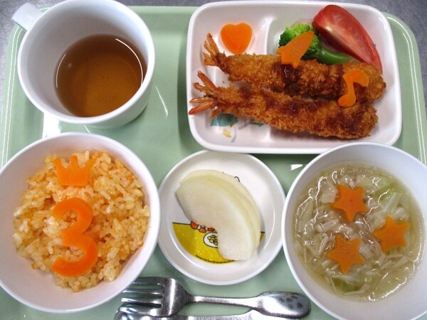 9月のお誕生会メニュー 9月のお誕生会メニュー*キャロットライス*エビフライ*そえやさい(とまと)*はるさめスープ*くだもの(なし)大きなエビフライに子どもたちはおおよろこびでした!!今日もごちそうさまでした♡ 2025/09/05