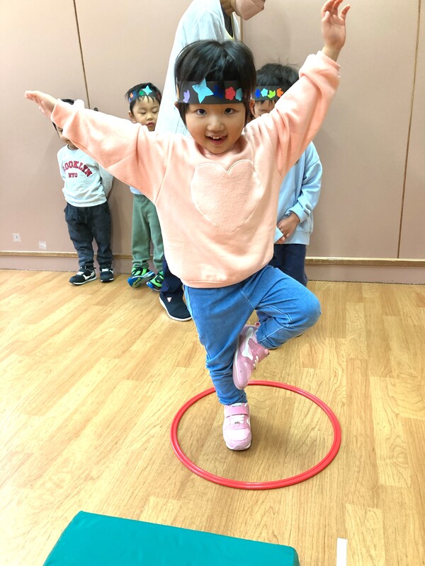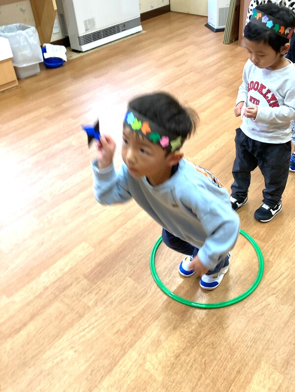 忍者は修行でござる!にんにん! こどもたちの忍者ごっこが盛り上がっています。もっと強くなるために、シュリケンはちまきを自分たちで作り、片足立ち・シュリケン投げなどの修行に励む子どもたちです。「にんにん!」と忍者になりきって遊んでいます(^^)/かっこいいね〜!! 2025/12/03