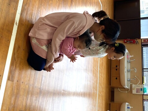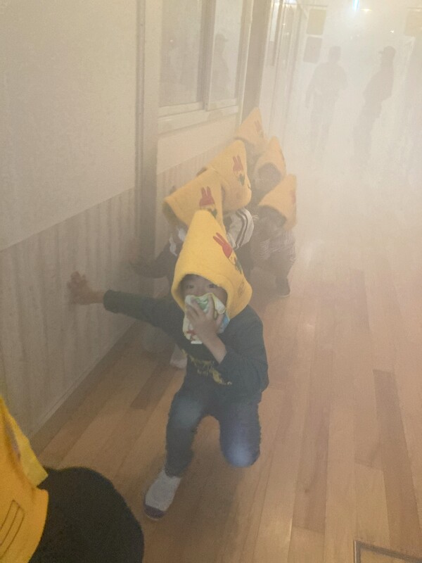 11月の避難訓練 今月の避難訓練は、消防署の方々に来ていただき、実際に煙の中での避難訓練を行いました。煙で真っ白になり視界が悪い中、臭いも感じながらの避難でしたが、子どもたちは上手に避難することができました。訓練終了後には、消防士さんに質問をしたり感想を伝えたりしました。職員は、119番の通報訓練もしました。いざという時に落ち着いて行動ができるように、訓練を積み重ねていきたいと思います。 2025/11/10